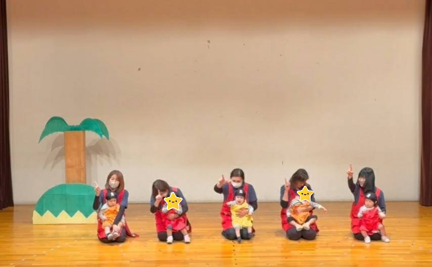 初めての舞台に泣いてしまったお友だちもいましたが 「♪だけど僕らはくじけない 泣くのはいやだ笑っちゃお 進め!」 の振り付けと決めボーズが可愛く決まりました。