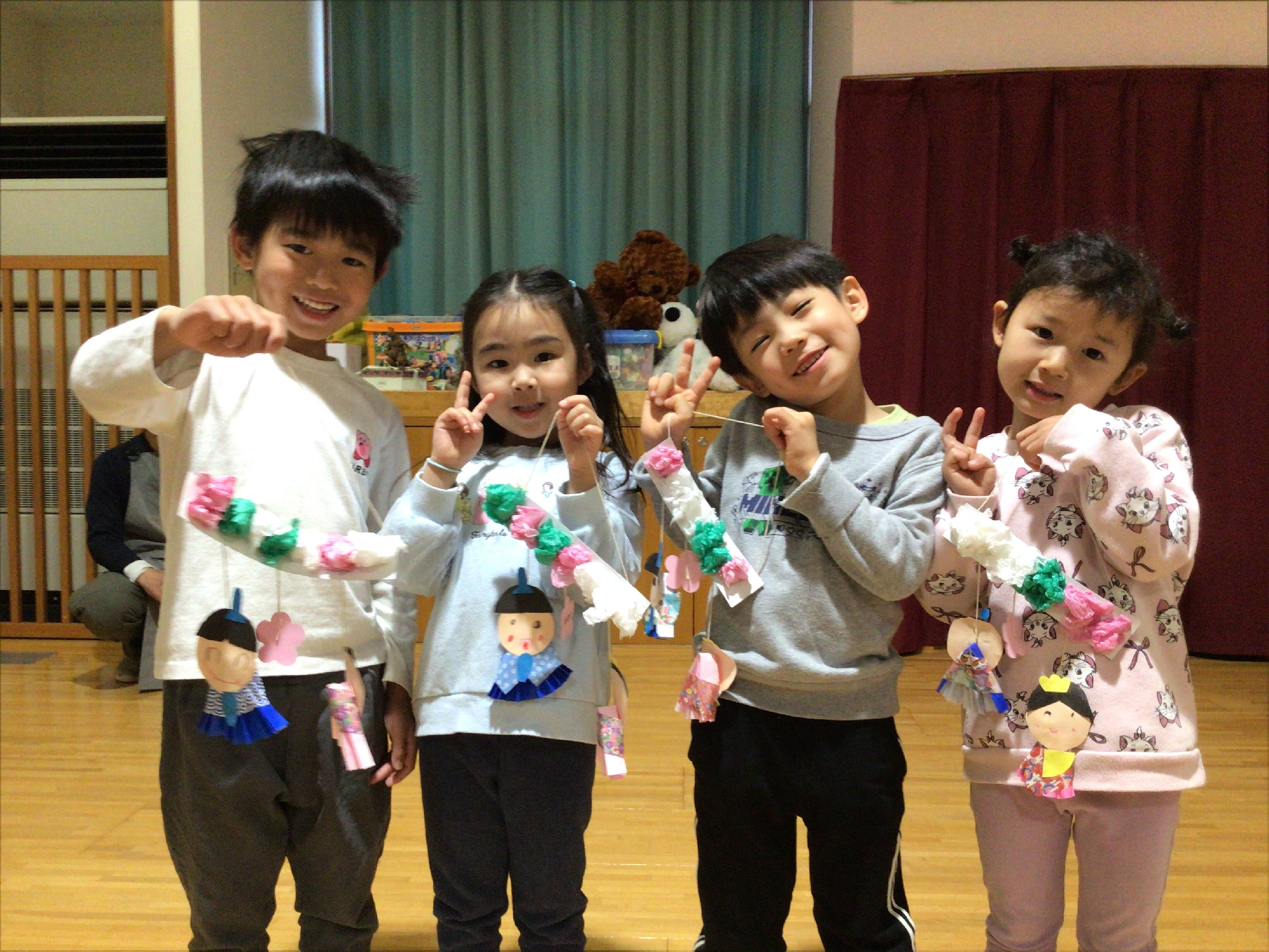 川口西保育園オリジナルおひな様の出来上がり!担任の先生を発見して、大盛り上がりでした。