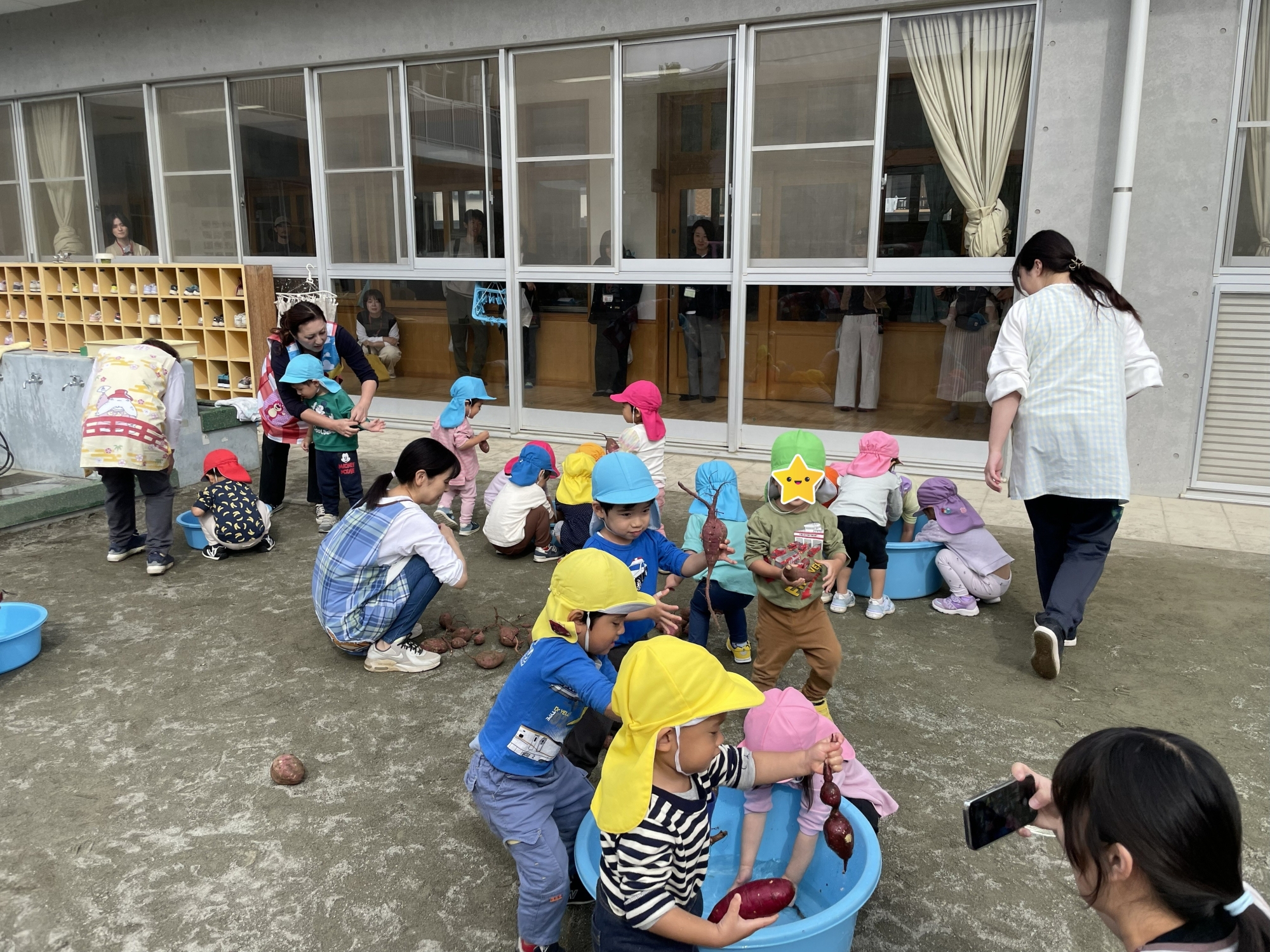 乳児組は、お部屋で朝の会の様子を見ていただいた後は、園庭でさつまいも洗いを行いました。このさつまいもは、年長さんが園庭で育てたさつまいもを掘ったものです。これは、明日のおやつのスイートポテトになるので、ごしごし頑張って洗ってくれましたよ。