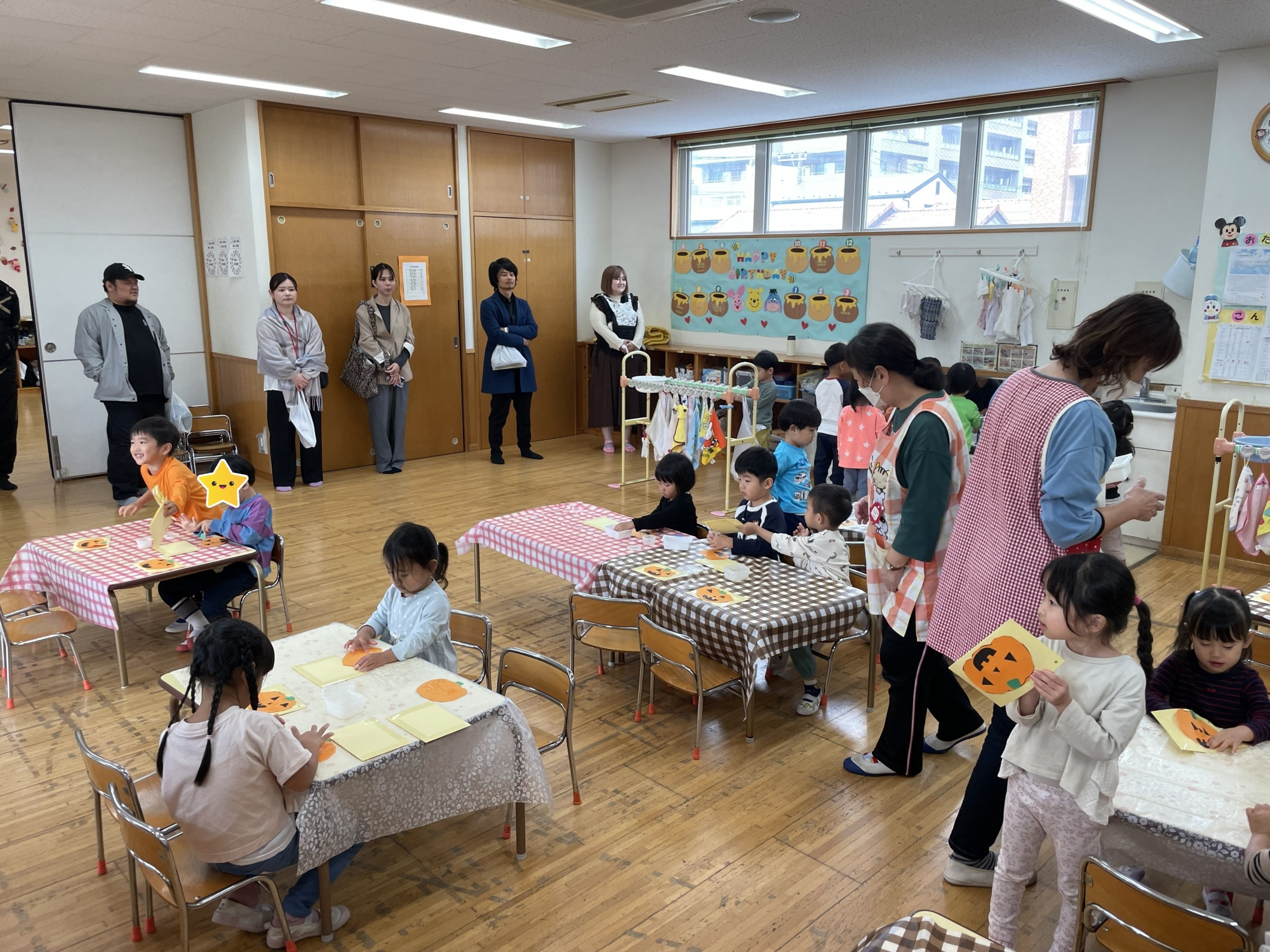 3歳児さんのお部屋では、ハロウィン制作をおこないました。のりの量を調節しながら、かぼちゃのおばけを完成させました。