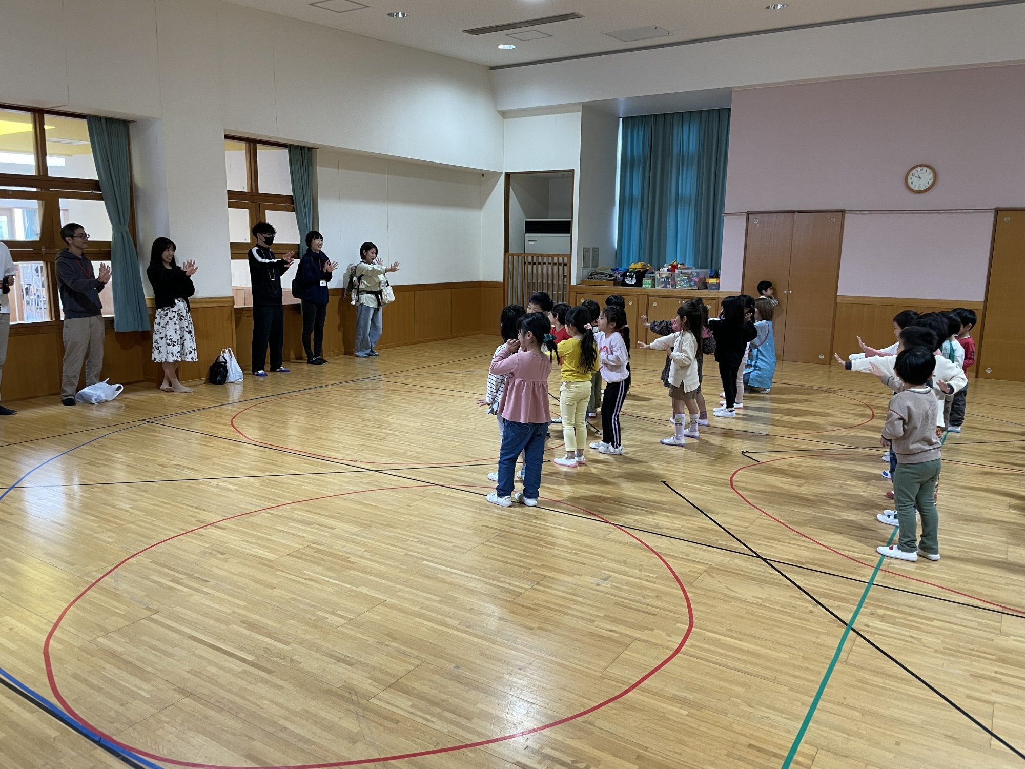 4歳児クラスさんの音楽指導では、保護者の方とどすこい手遊びの勝負です。