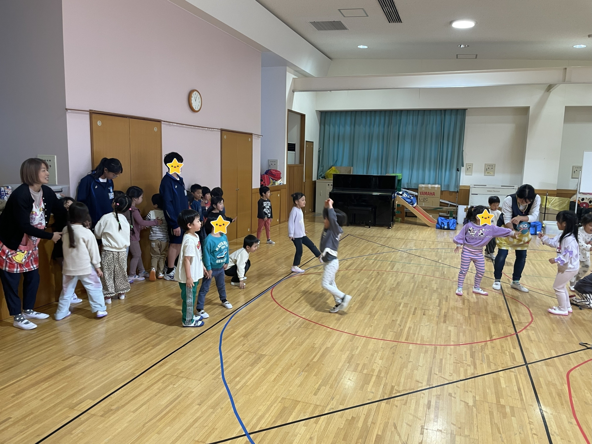 ホールで『たまご進化ゲーム』を行いました。子ども達と一緒に真剣に遊んでいる姿が印象的でした‼