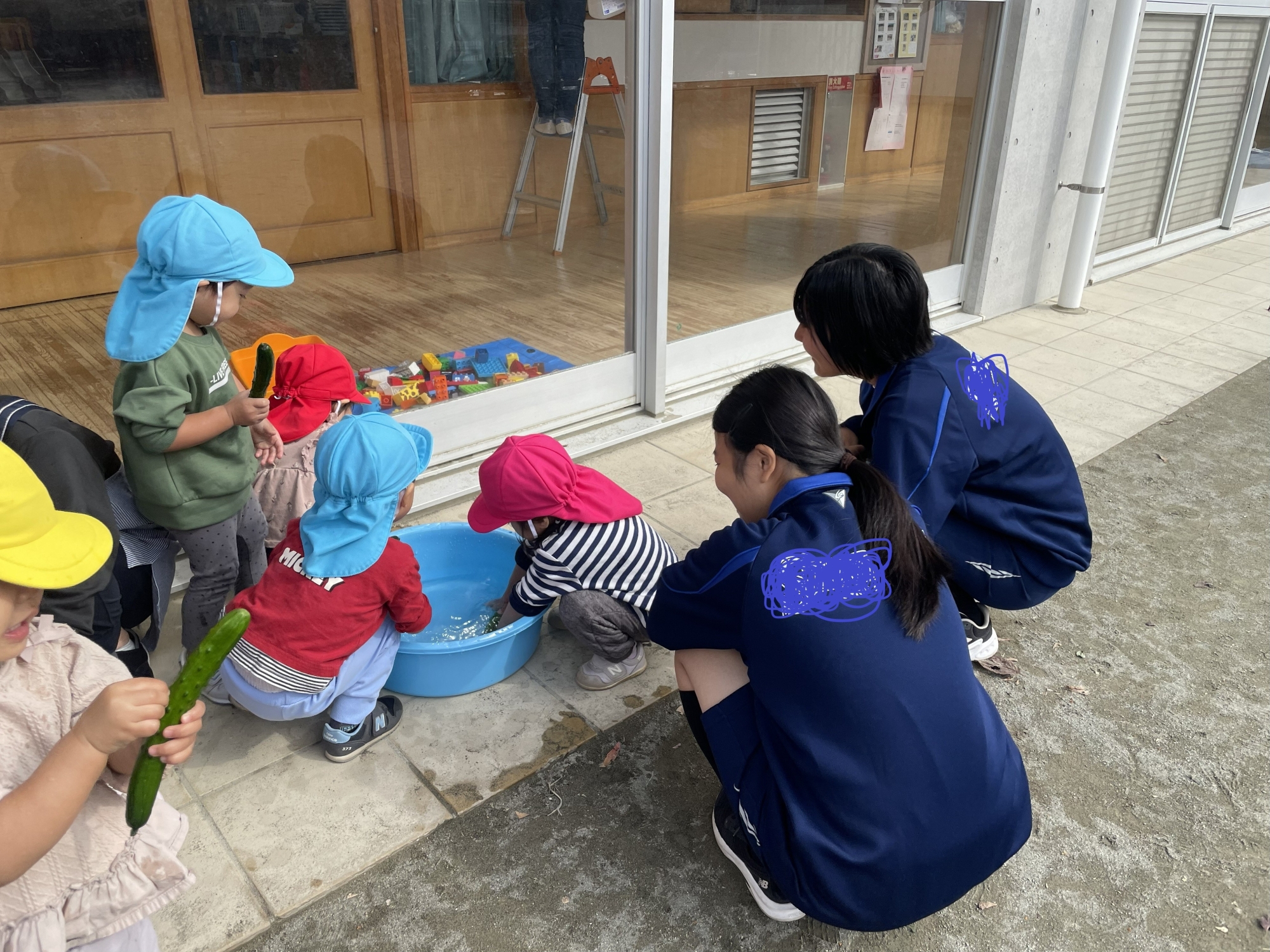 食育の一環できゅうり洗いを行いました。優しく見守る姿が素敵ですね。