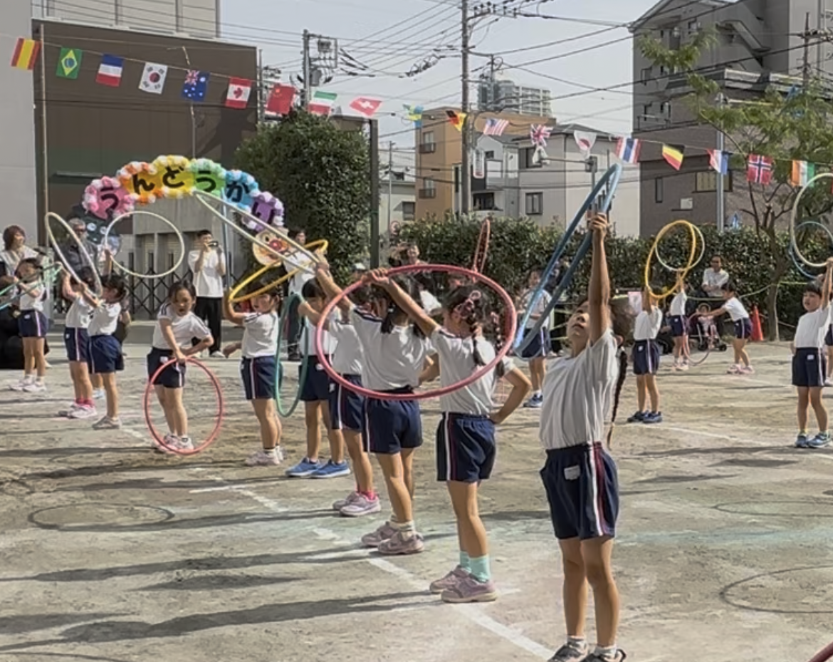「フープ体操」では、左右の向きやジャンプのタイミングなどみんなで合わせることが多くて難しかったですが、みんなで声を掛け合い揃えることができるようになりました。みんなで力を合わせて心を一つにが頑張りました‼
