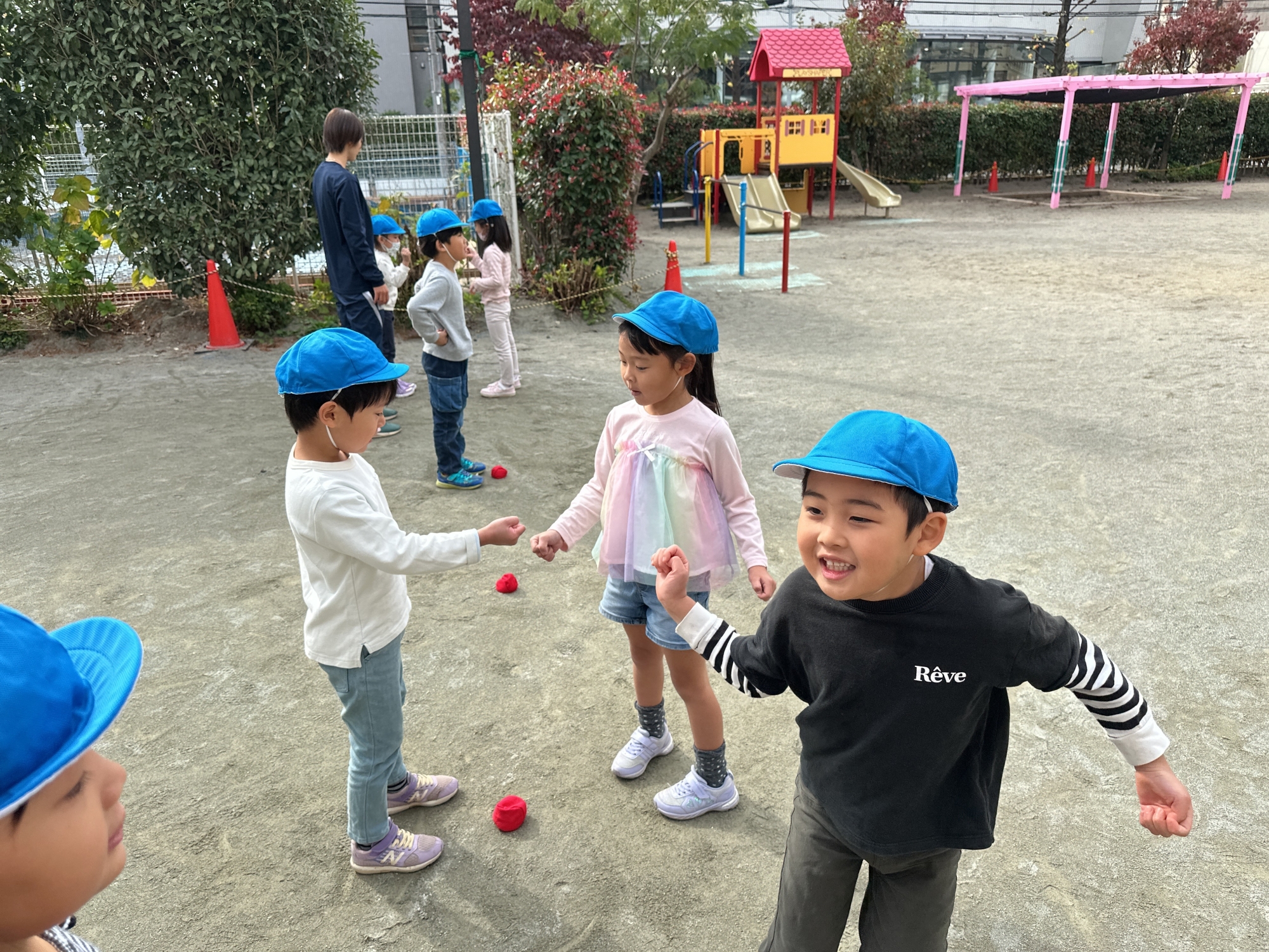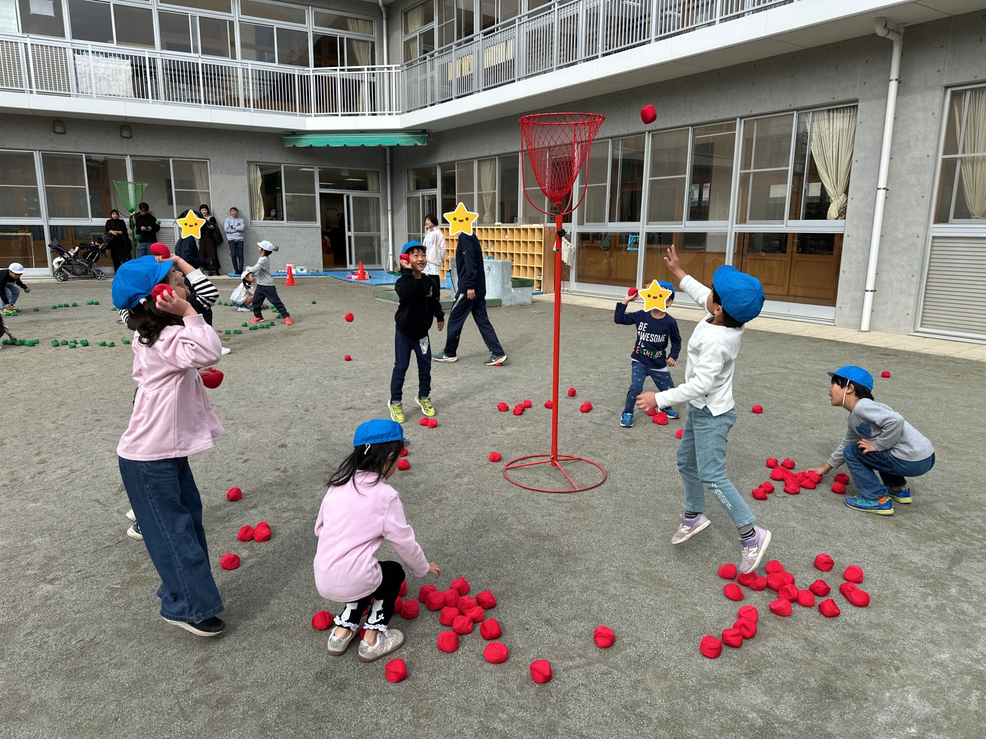 狙って投げることを意識して、玉入れ競争です。どっちがたくさん入れられるかな?