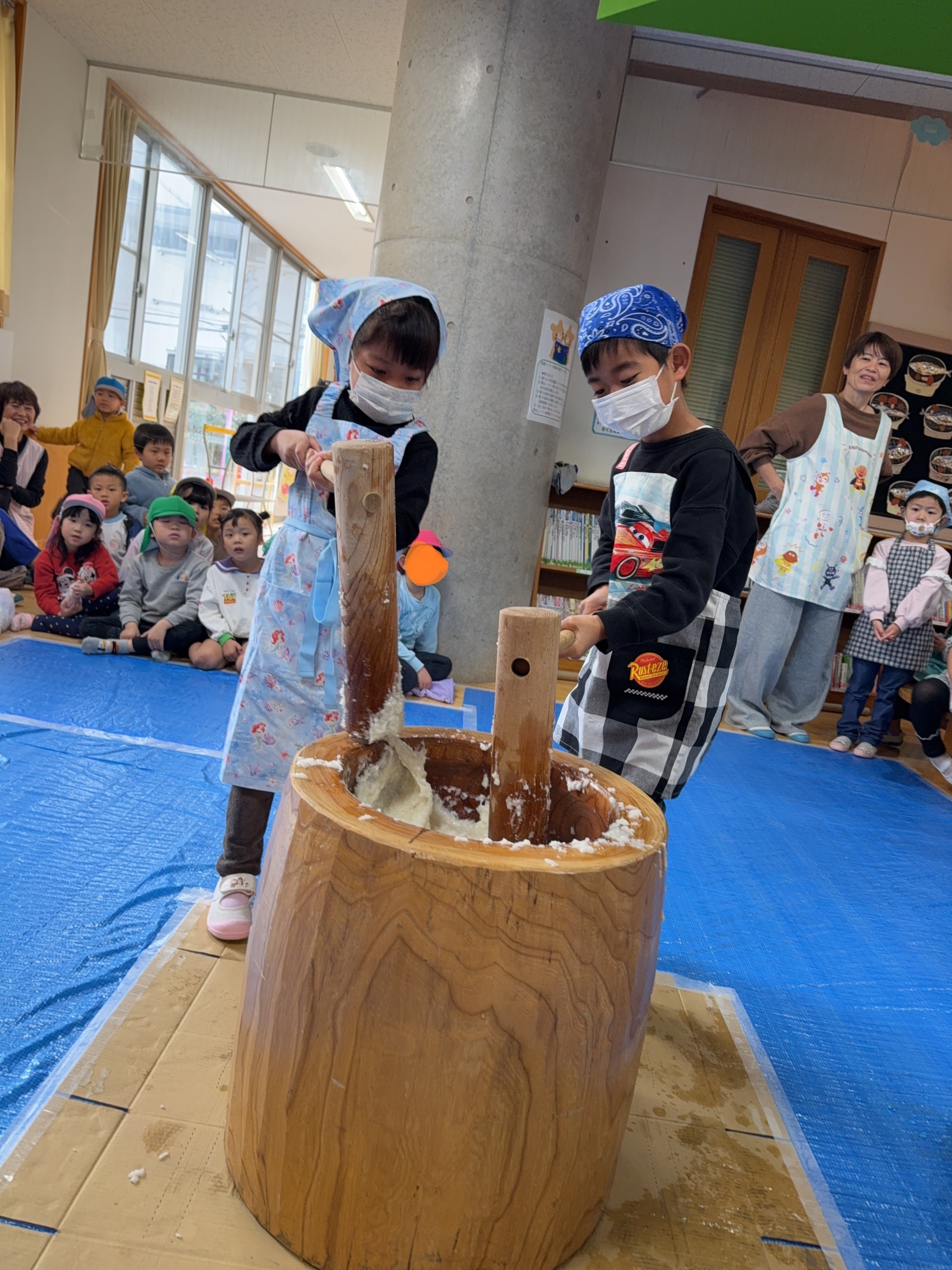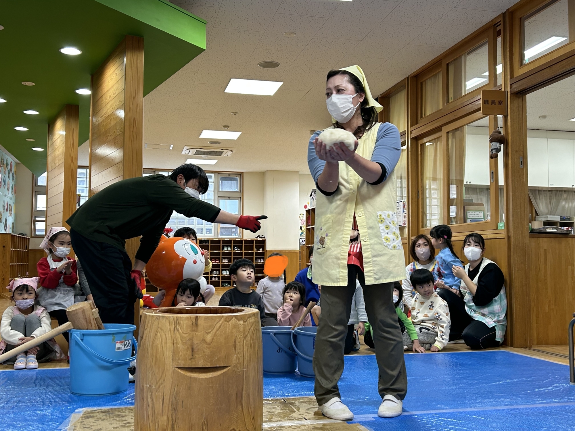 さくらぐみ・うめぐみのお友達もおもちつきにチャレンジ!「よいしょー」の掛け声とともに頑張ってくれました。