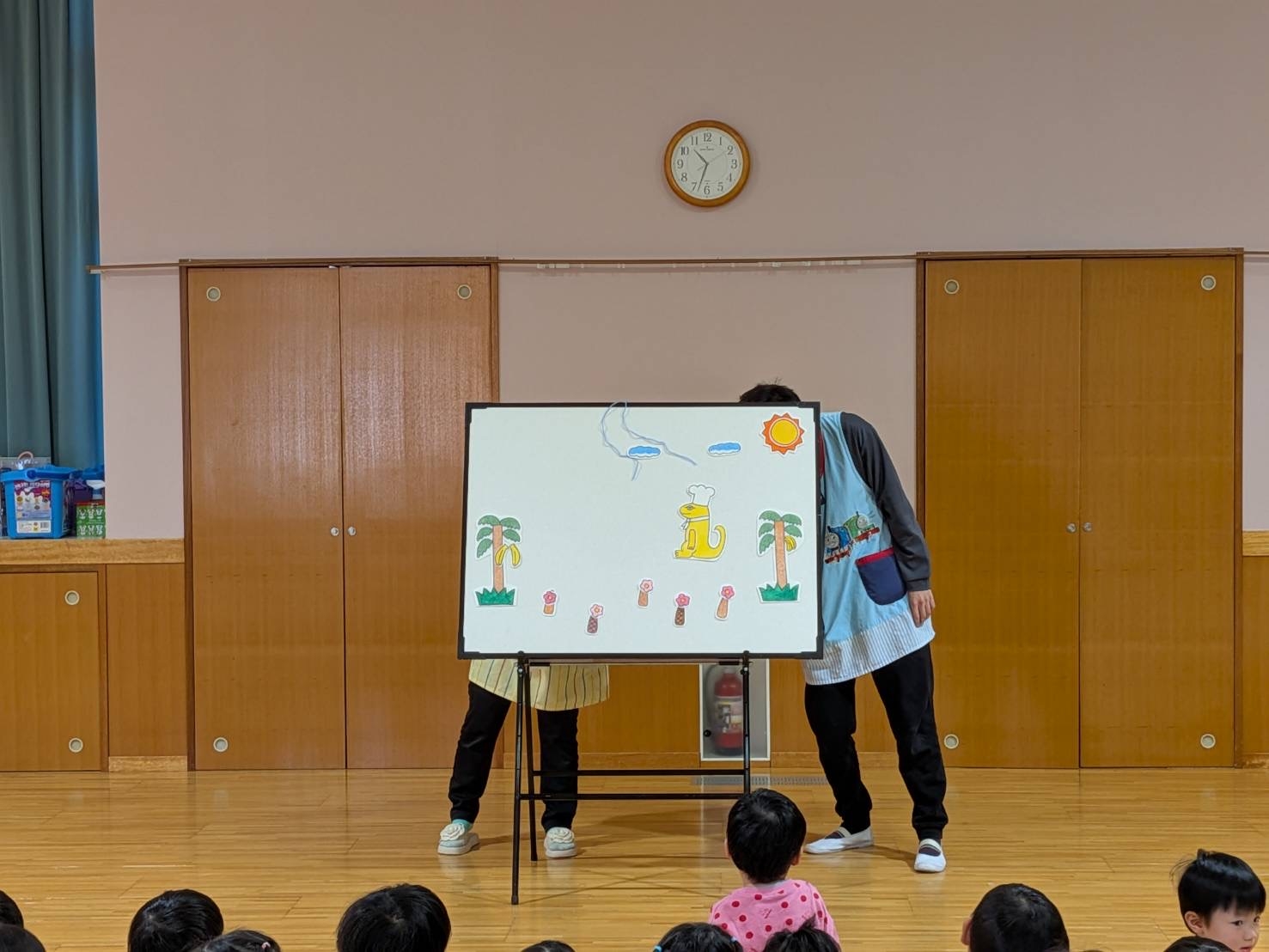 先生の出し物はパネルシアター「イグアナレストラン」でした。レストランには動物のお客さんが次々登場し、お花やお日様が素敵なお料理に変身✨最後には大きなケーキも登場し、音楽に合わせてみんなのお誕生日を一緒にお祝いしました。